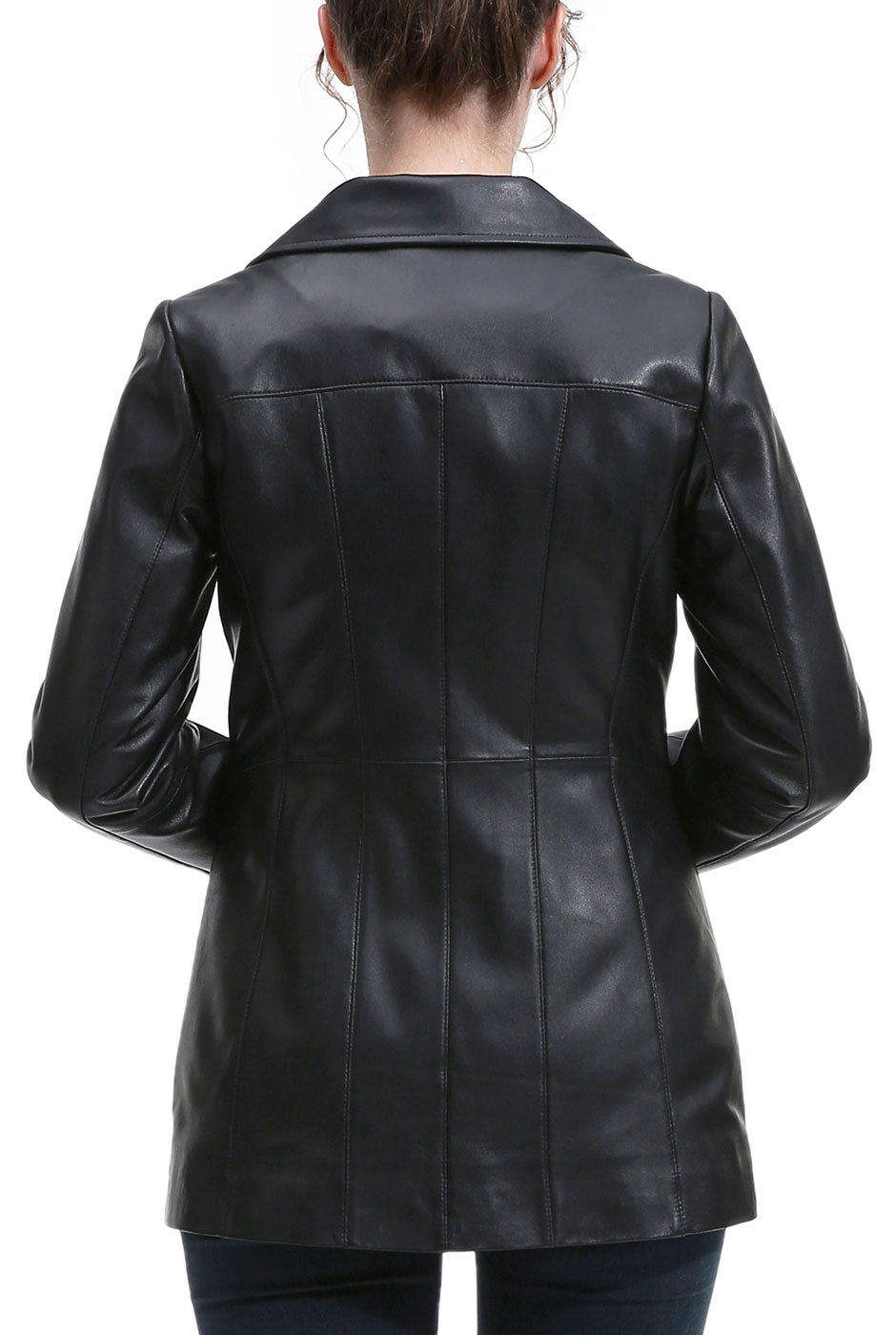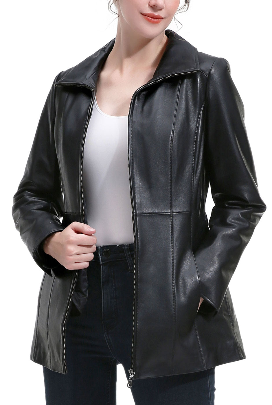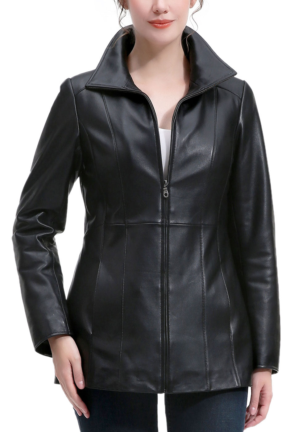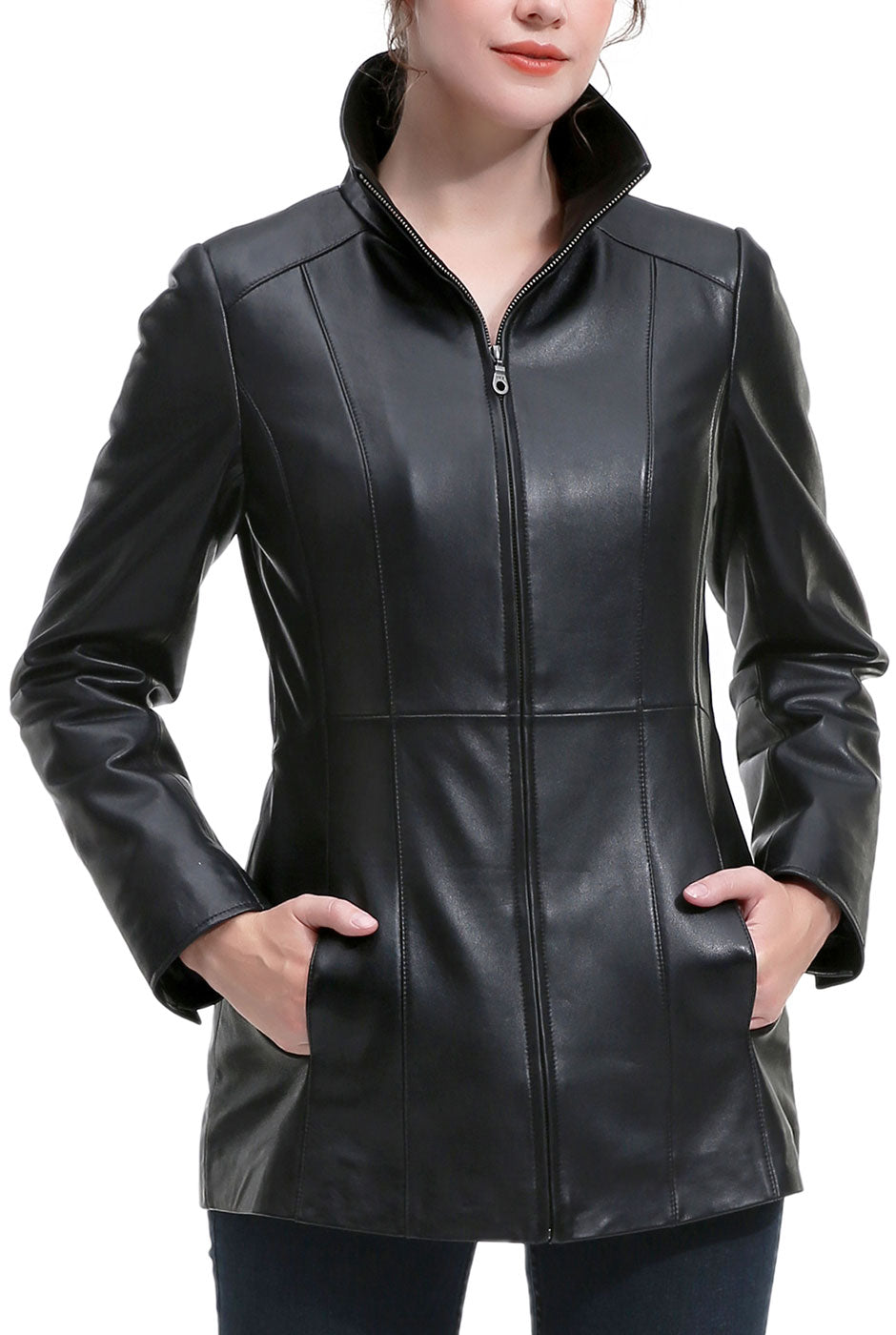 Effortlessly polished with a modern edge, the Women’s Amy Leather Jacket combines sleek tailoring with everyday versatility. Designed with clean vertical seaming and a streamlined silhouette, this refined style creates a flattering, sculpted fit while maintaining a timeless aesthetic. The structured stand collar adds contemporary sophistication, while the smooth zip-front closure enhances its minimalist appeal. Perfect for transitional layering, the Amy Leather Jacket pairs seamlessly with both casual and elevated looks, offering a versatile wardrobe staple that delivers understated elegance season after season.