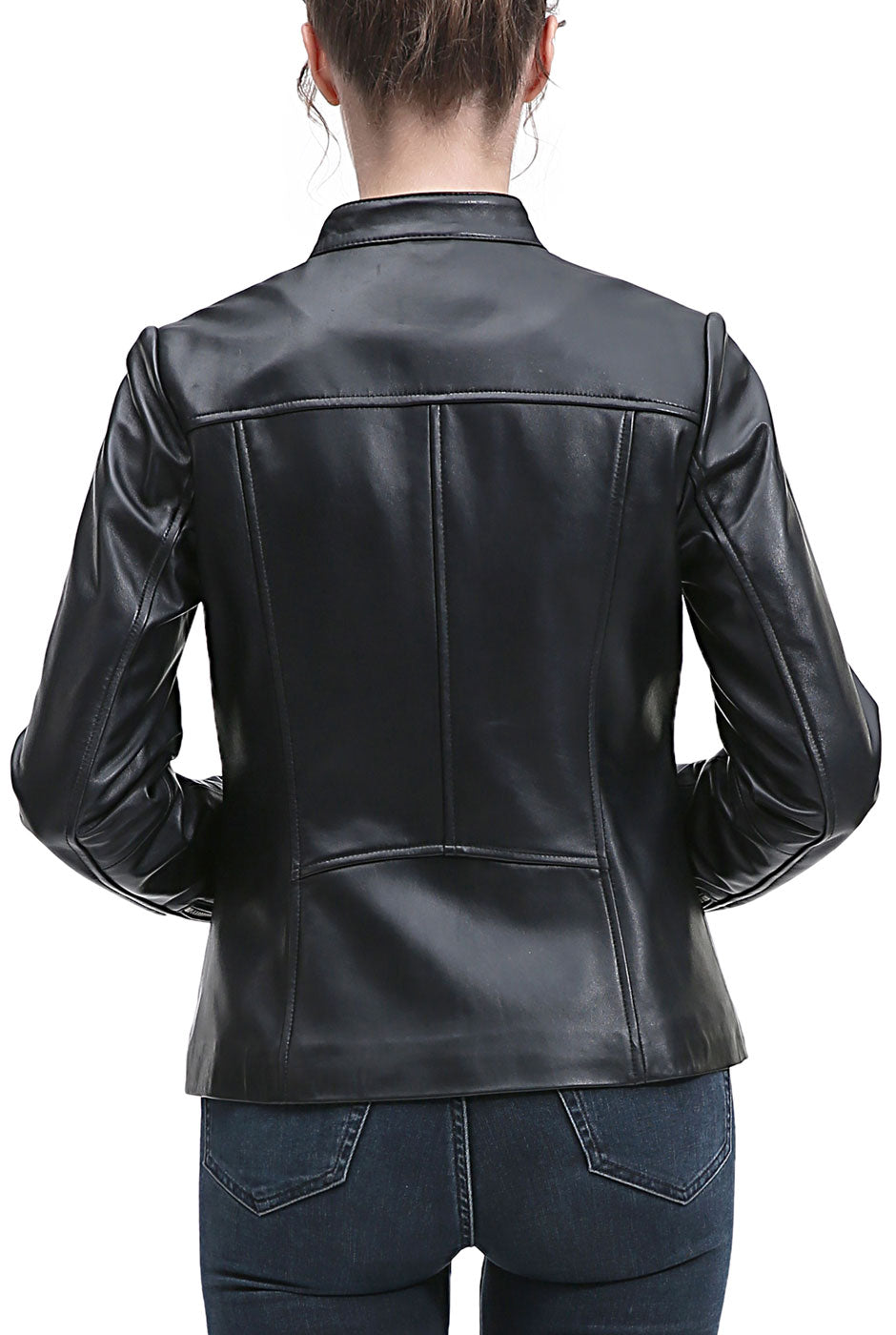 Sleek stand collar with snap-tab closure for modern moto styling