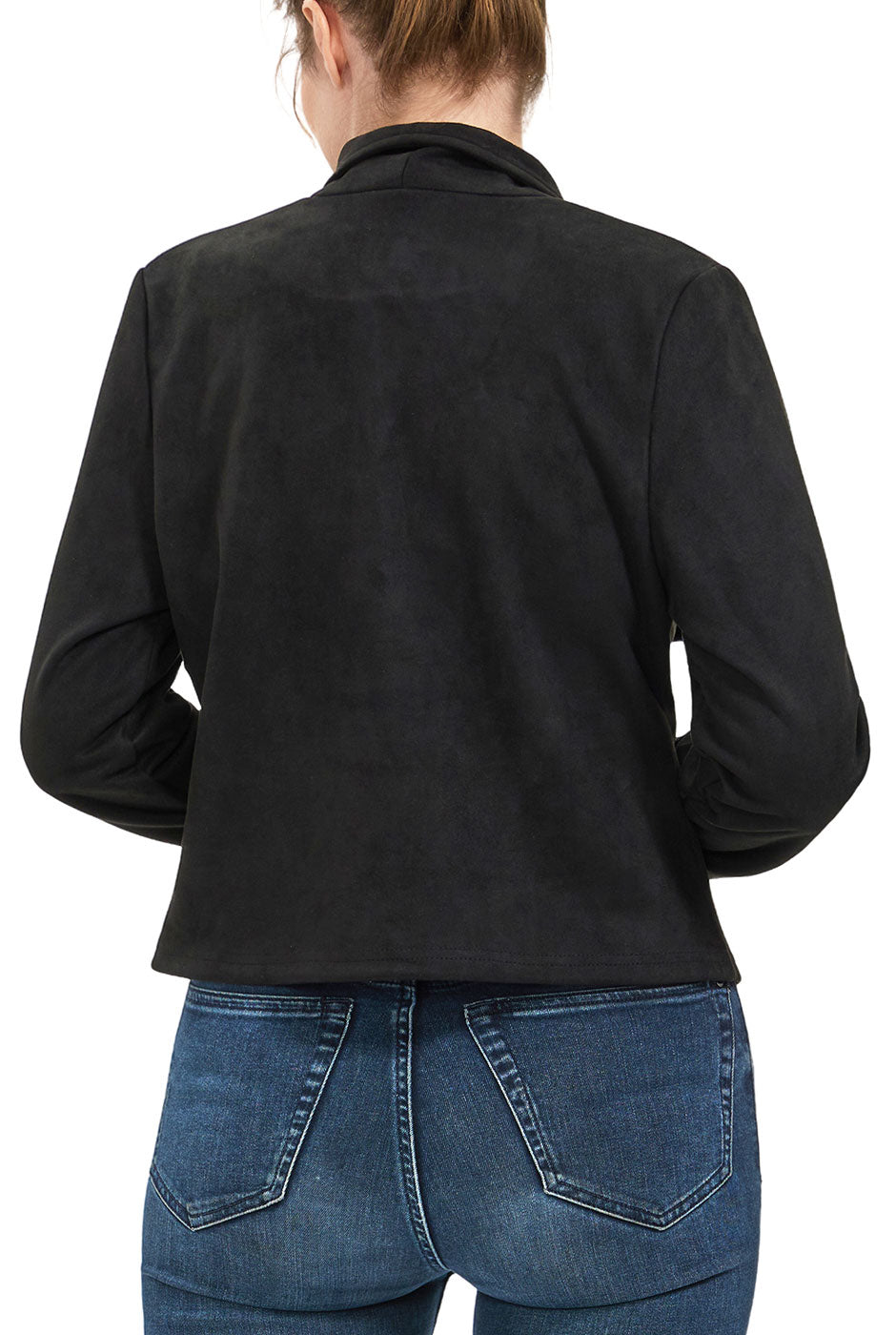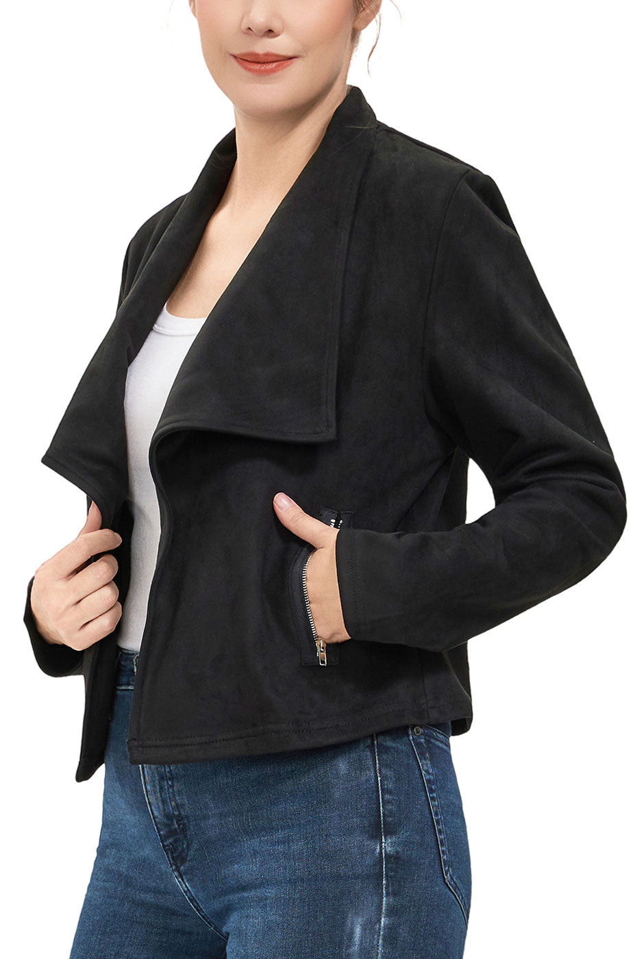 Effortlessly chic and endlessly versatile, the Women's Faux Suede Open Front Jacket brings a polished layer to your everyday wardrobe. The soft faux suede finish adds a luxurious touch, while long sleeves and two functional zipper pockets provide practicality and style. Whether paired with jeans, trousers, or dresses, this lightweight jacket is the perfect transitional piece for day or night.