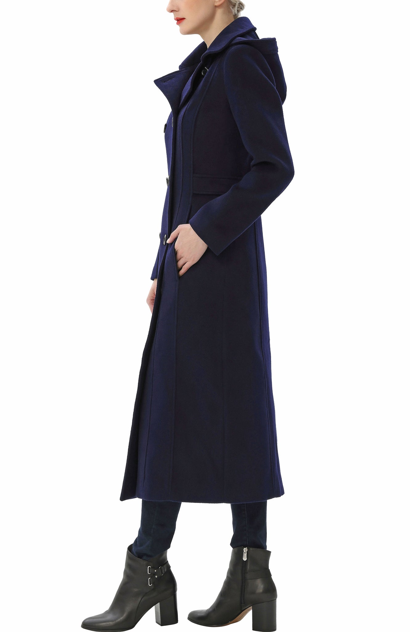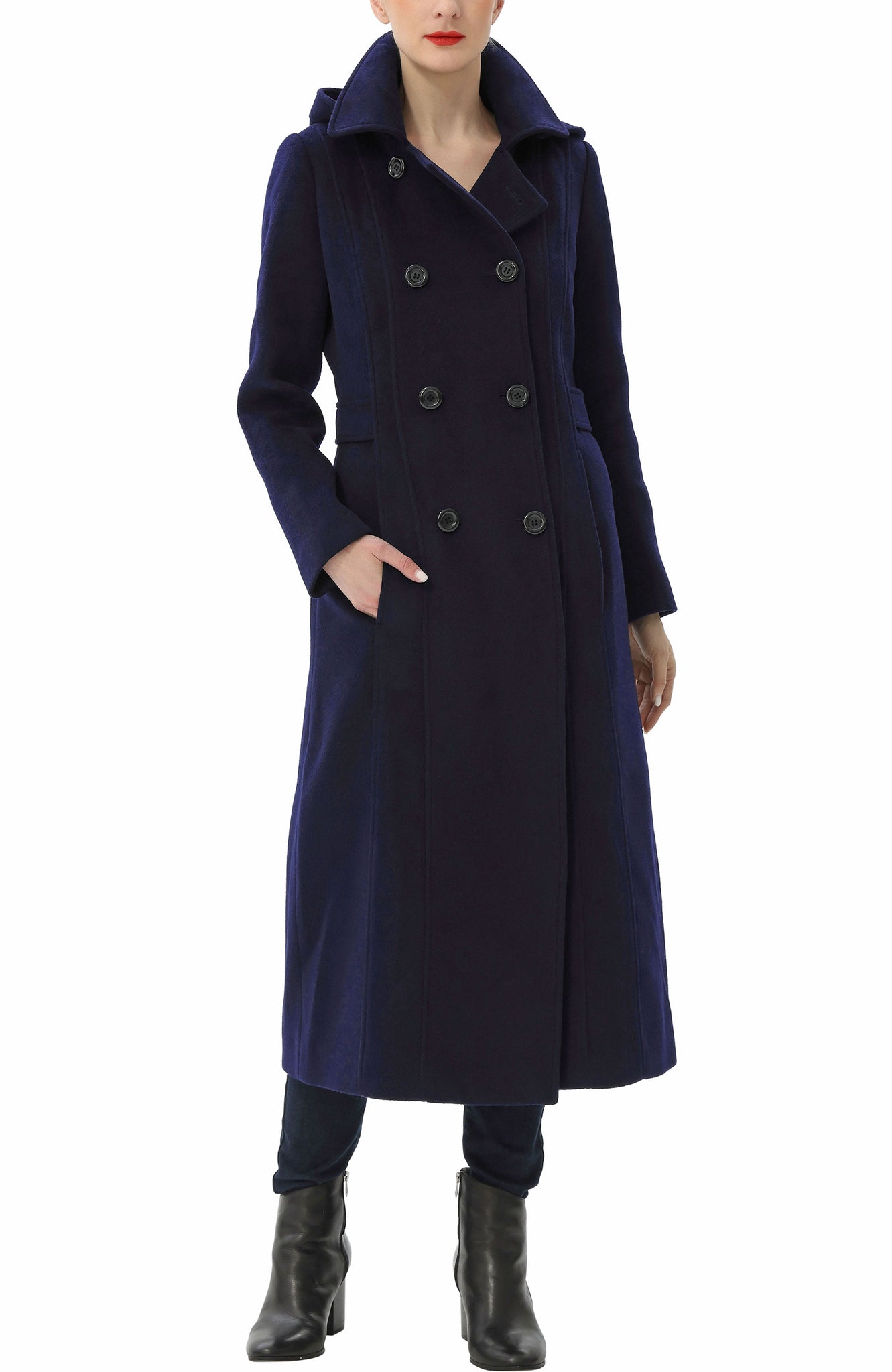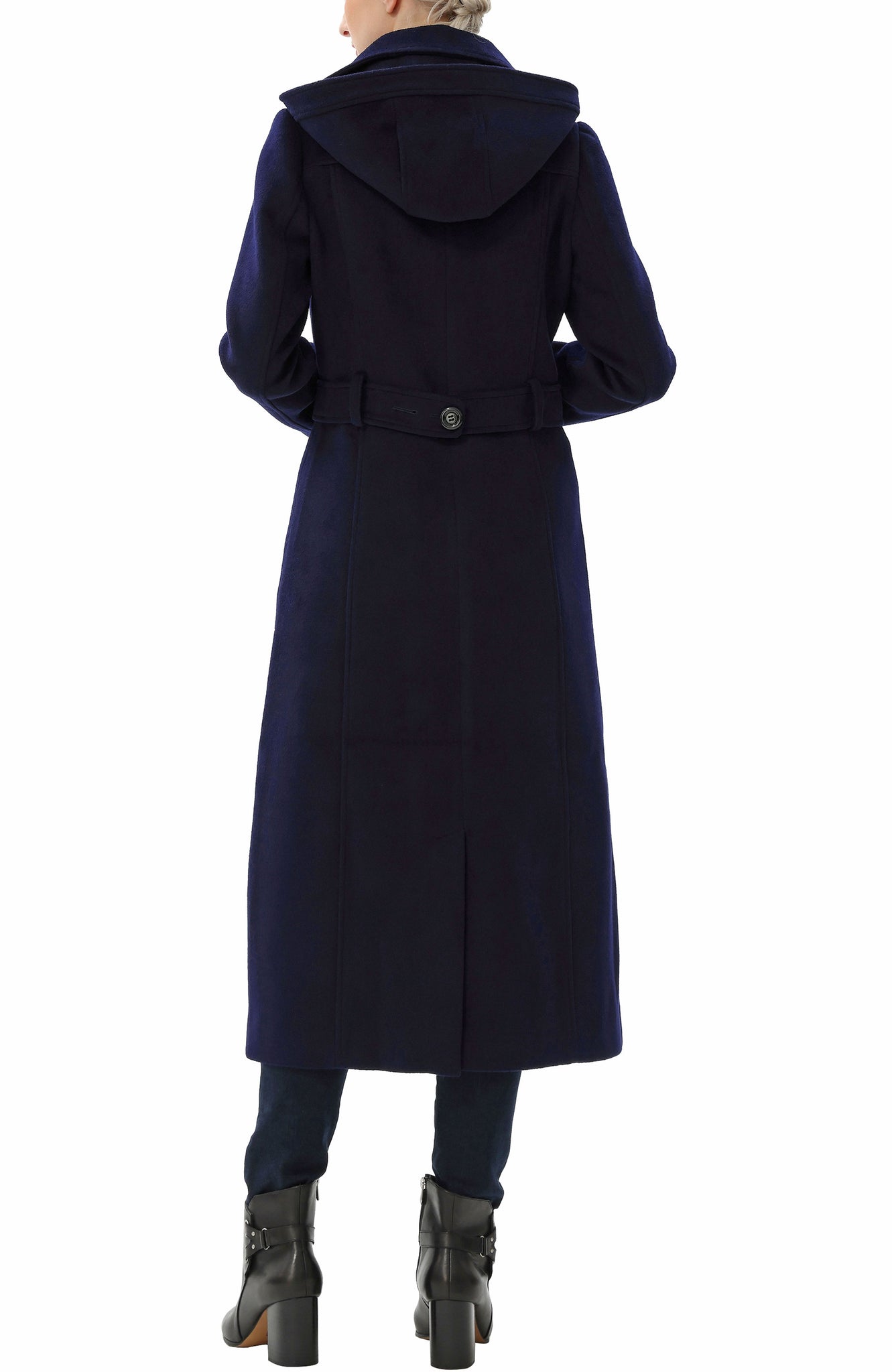 This mid-calf length double-breasted wool blend walking coat features button front closure with a spread collar and removable hood. Features a center back vent allows for better maneuverability, and an adjustable waistband allows for a more customized fit.